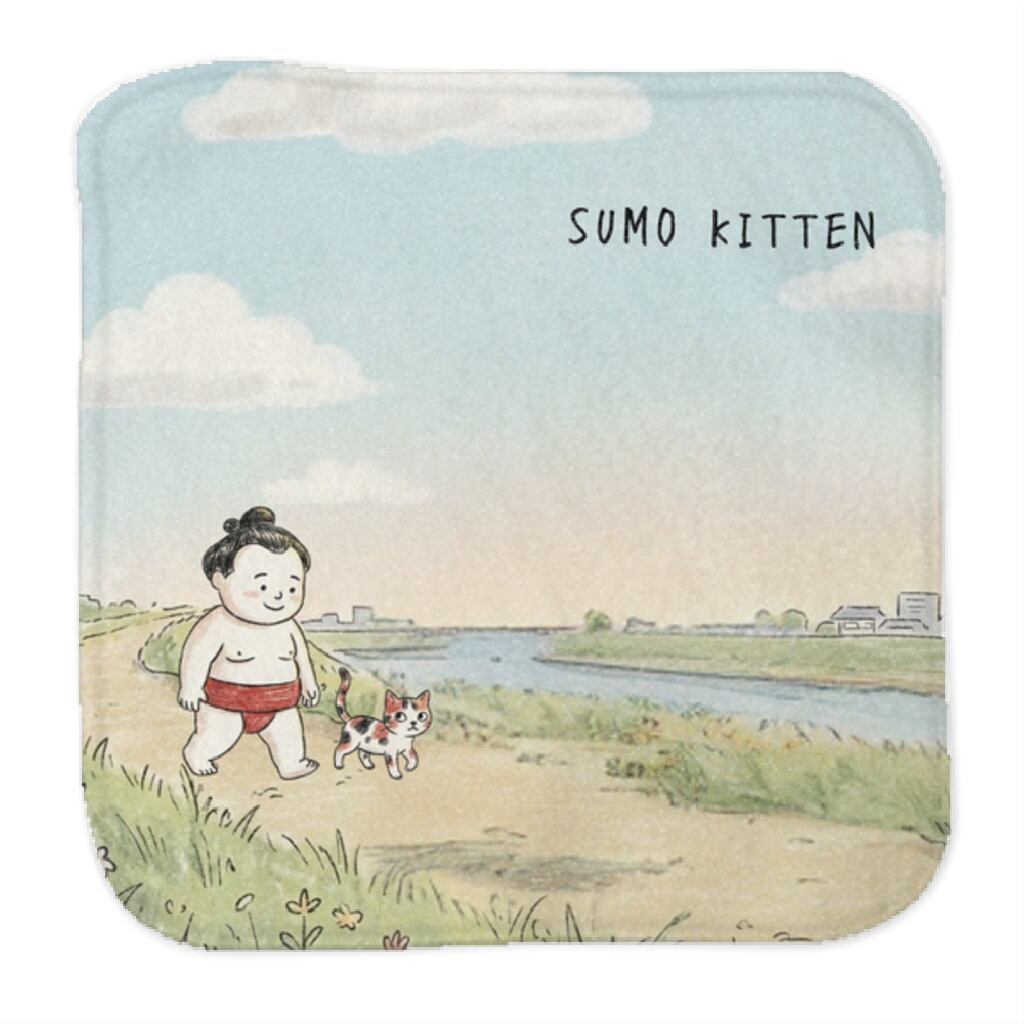 使うたびに心ほどける、ほっこり癒し系。お相撲さんと三毛猫の優しい世界観を持ち歩く、水彩画風のミニタオル。